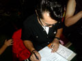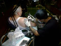 フリマやら、出店やら、バンド・DJやら、足つぼマッサージ等々様々な催し物が出され学園祭ライクなアットホームなイベント。バンドはSTRにも出てくれたThe Predidentsやキャフラダ等々これまた様々なメンツが揃っておりました。さらにワタクシもお世話になっている彫氏のISHIも参戦。ミンナが見守る中、一生懸命彫っておりました。